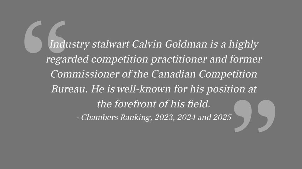 “Industry stalwart Calvin Goldman KC is a highly regarded Toronto-based competition lawyer and former commissioner of the Competition Bureau. He is well known for his position at the forefront of his field”